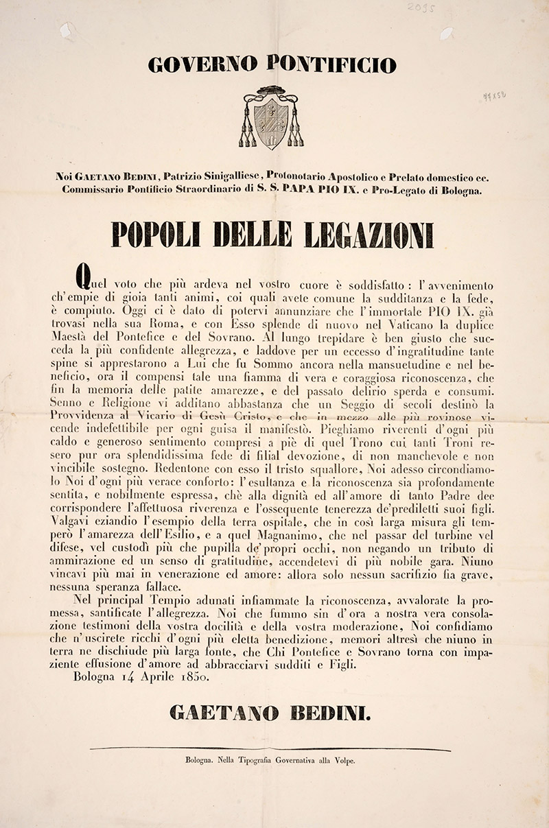 Annuncio ai popoli delle Legazioni del ritorno di Pio IX a Roma, 14 aprile 1850