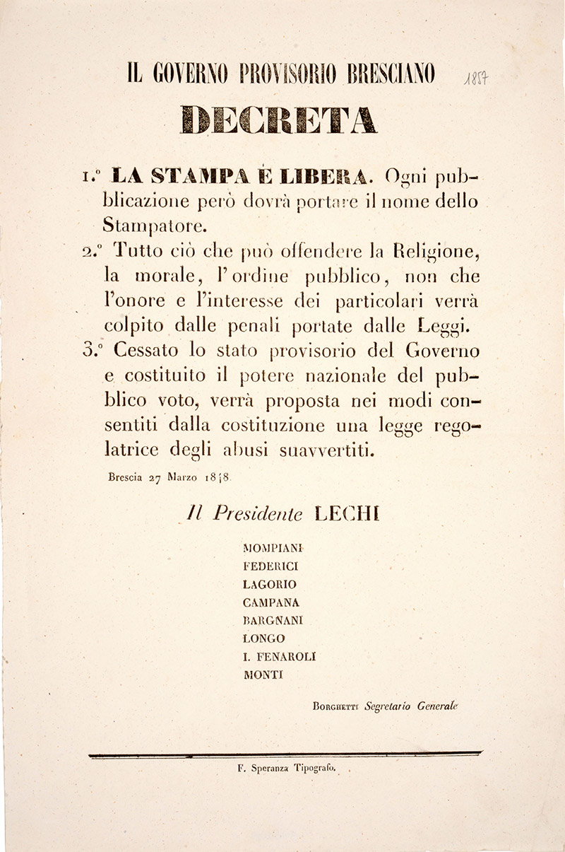 Decreto del Governo provvisorio di Brescia relativo alla libertà di stampa, 27 marzo 1848