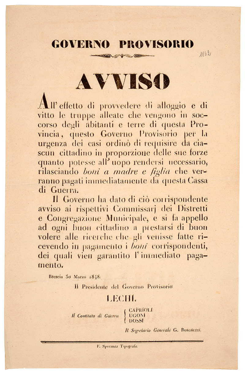 Avviso del Governo Provvisorio di Brescia ai cittadini a provvedere al vitto e alloggio delle truppe alleate, 30 marzo 1848
