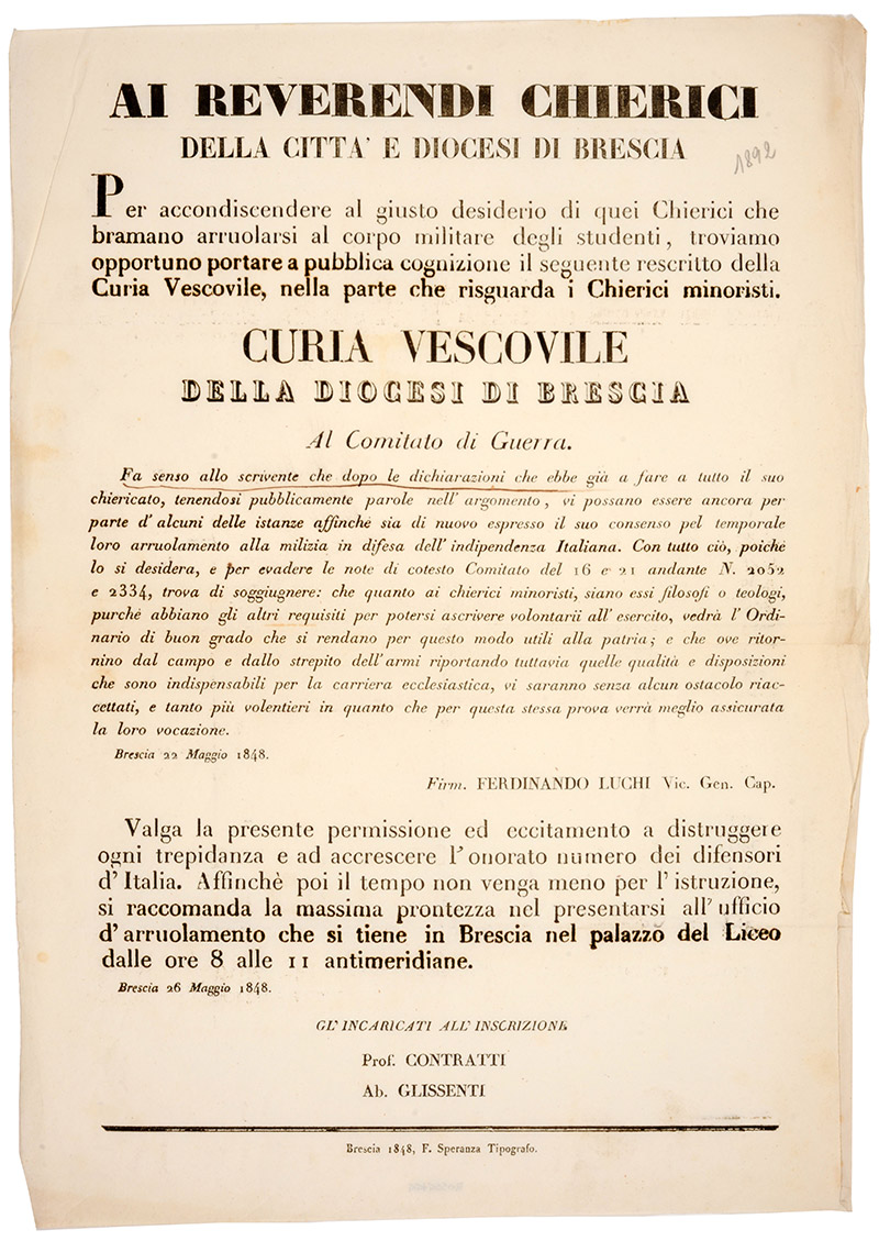 La Curia vescovile della diocesi di Brescia acconsente all'arruolamento dei chierici minoristi, 26 maggio 1848
