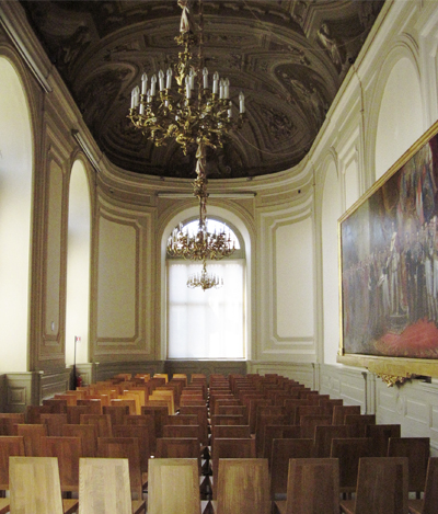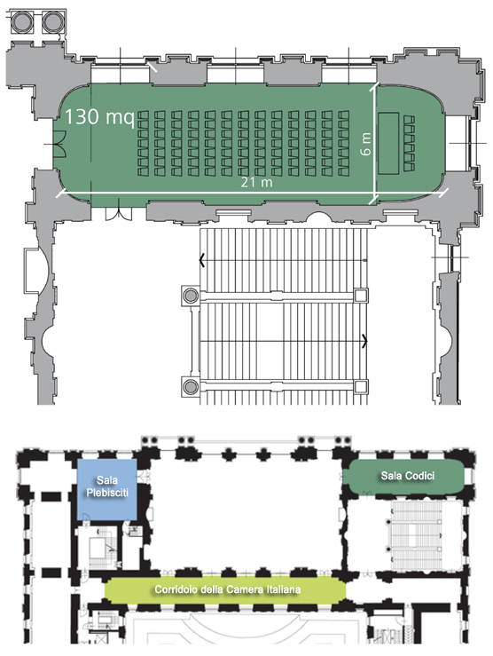La Sala Codici – 130 mq – con volta affrescata del Gonin e il dipinto di G.B. Biscarra, Promulgazione del Codice Civile (20 giugno 1837), si affaccia su piazza Carlo Alberto con vista sulla Mole antonelliana.